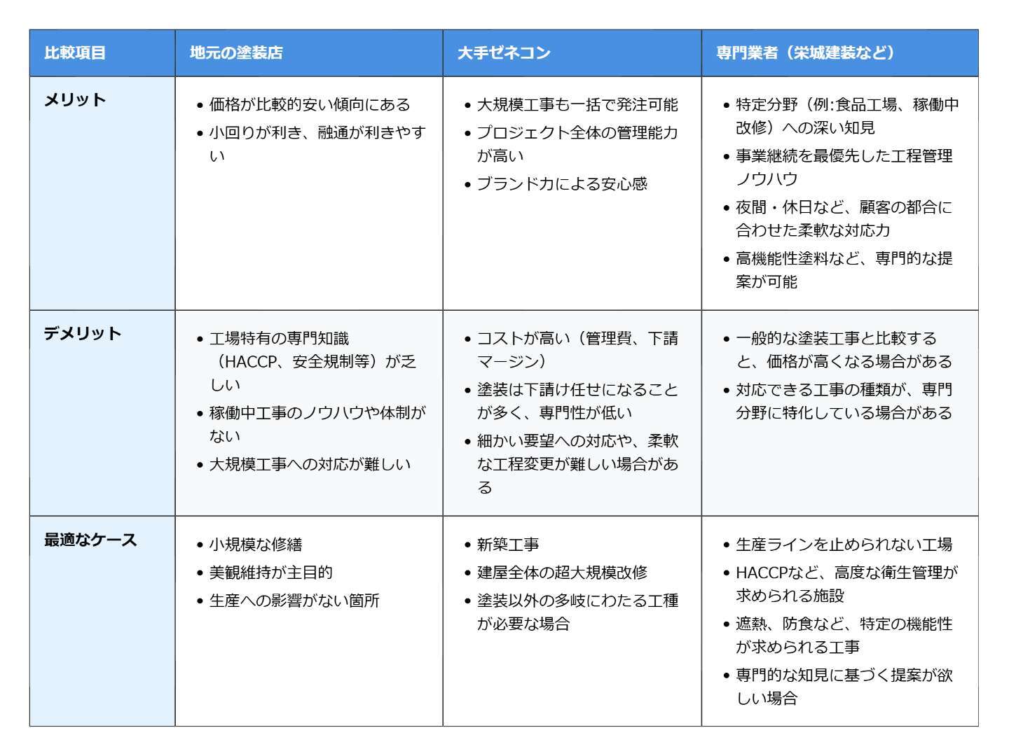 本記事では、佐賀・福岡エリアで多くの工場改修を手掛けてきた我々が、「地元の塗装店」「大手ゼネコン」「専門業者」という3つの選択肢を徹底比較し、「生産を止めない」という、工場にとって最も重要な観点から、貴社にとって最適なパートナー選びの指針を示します。